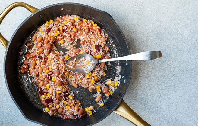 Arrange cooked rice on plate. Add mixed bean chilli. Garnish with grated vegan cheese.